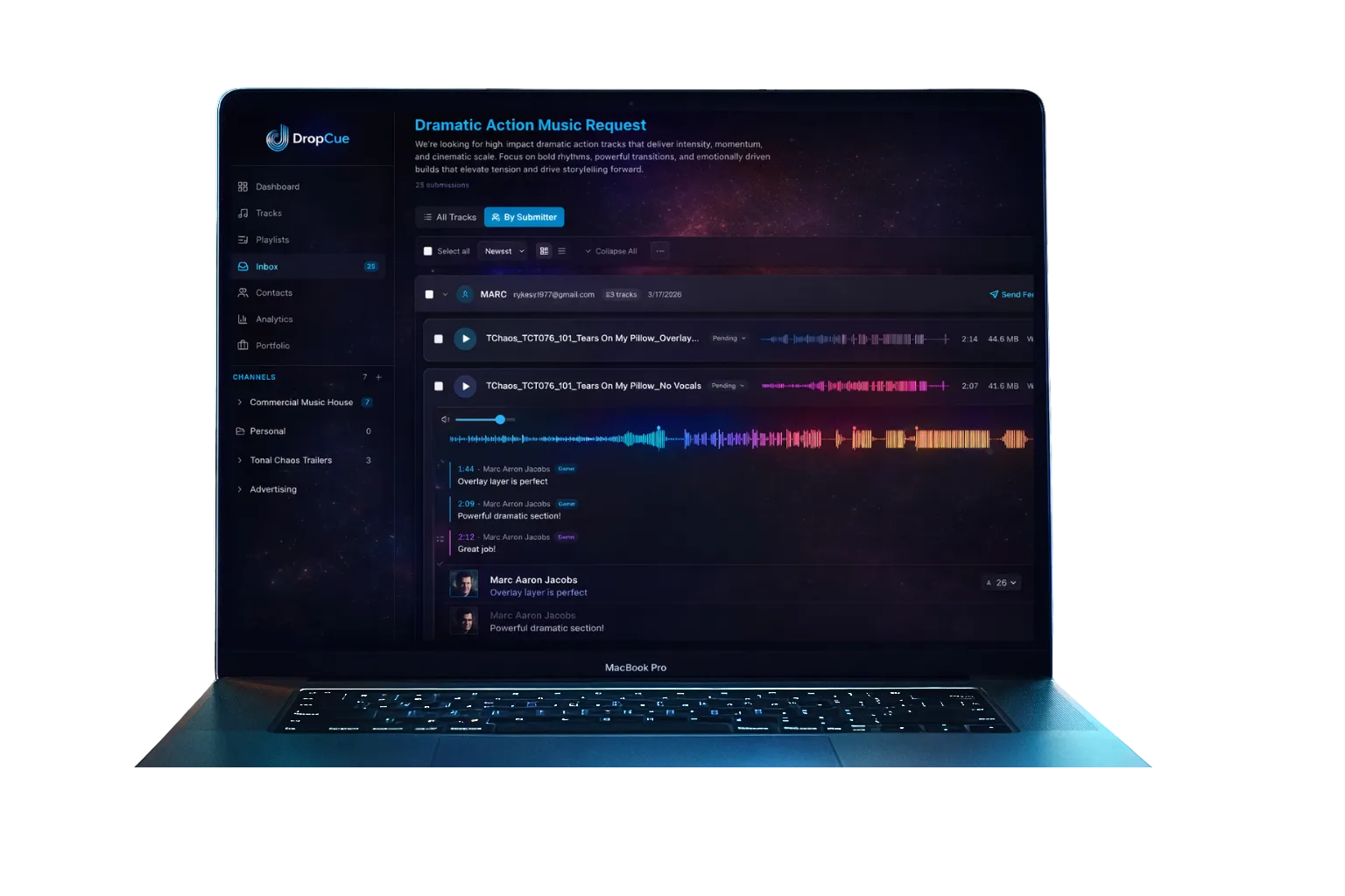 You get feedback tools. If the supervisor wants to comment on a specific moment — "love the swell at 1:47, can you send an instrumental?" — they click the waveform and pin the comment to that timestamp. You get the feedback with zero email ambiguity.